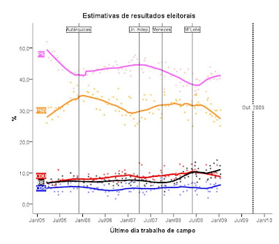 2. Ao longo dos últimos três anos, julgo ter informação sobre todas as sondagens realizadas pela Marktest e pela Eurosondagem, para além das do CESOP/Católica, naturalmente. No total, são 44 da Eurosondagem, 39 da Marktest (que não coloca dados no site desde Novembro) e 9 do CESOP. Sabemos, contudo, que a Aximage e a Intercampus também têm conduzido sondagens. Uma pesquisa muito minuciosa na Net, nos sites da TVI e do Correio da Manhã, permitiu detectar 5 sondagens da Aximage e 3 da Intercampus. Há sem dúvida mais sondagens da Aximage, mas as notícias do Correio da Manhã na Net anteriores a Julho de 2008 apresentam apenas intenções de voto brutas no PS e no PSD. No caso da Intercampus, se houve sondagens antes de Junho de 2008, não as consegui encontrar. Se alguém tiver a informação em falta e quiser enviar-me, ficarei grato.