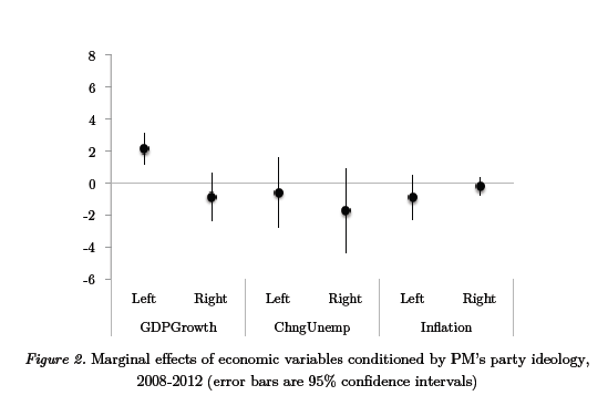 The second type of answer has been to suggest that the electoral performance of incumbents in Europe and other industrialized nations has been “business as usual”: retrospective voting, with voters punishing or rewarding incumbents on the basis of economic performance. In a widely circulated paper, summarized here, Larry Bartels looks at incumbent parties’ electoral performance in the OECD from 2007 to 2011, and makes two arguments. First, that “election outcomes over the course of this ‘Great Recession’ have provided little evidence of meaningful judgments on ideology or policy” (Bartels 2012: 44). Second, that economic performance, namely economic growth, accounts well enough for electoral outcomes in this period: “in periods of economic crisis, as in more normal times, voters have a strong tendency to support any policies that seem to work, and to punish leaders regardless of their ideology when economic growth is slow” (Bartels 2012: 50).