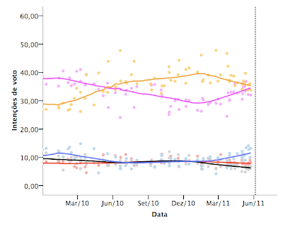 Olá Pedro, obrigado pela sua resposta. Depois pensei um pouco mais. Como referiu, o facto de haver muitas sondagens neste curto período acaba por alterar as linhas do gráfico, ajustando as médias imediatamente anteriores. Por exemplo, a subida do CDS também se suavizou, certamente devido aos 10% na sondagem da Católica.