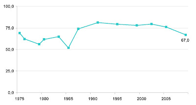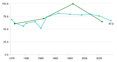 O primeiro mostra a soma das percentagens de votos válidos obtidos pelo PS e pelo PSD em cada eleição. Em 1979 e 1980, a votação do PSD é estimada como uma proporção do voto na AD, calculada na base da média dos resultados PSD, CDS e PPM nas eleições imediatamente anteriores e posteriores. E para 2009, os 67% são a estimativa das sondagens para Março de 2009, controlados “house effects”. O que o gráfico diz é simples: se as eleições fossem hoje (eu sei, eu sei), PS e PSD teriam, no seu conjunto, o pior resultado desde as eleições de 1985.