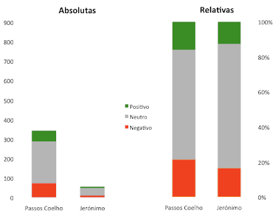 Não mudei a escala à esquerda do dia anterior só para percebermos como Passos Coelho e Jerónimo de Sousa geraram muito menos menções na twittosfera que Portas e Sócrates. Saldo entre menções positivas e negativas muito parecido para os dois.
