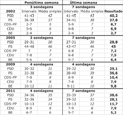Para além daquilo que o Fernando fez, vou apenas actualizar um quadro que já tinha aqui apresentado. Vou considerar como sondagens da última semana apenas as que tinham amostras independentes: