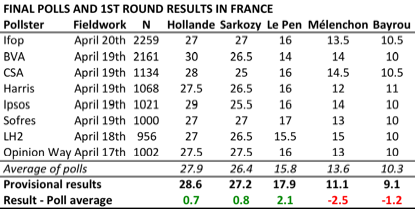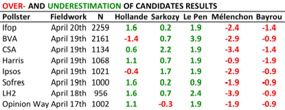 A pollster-by-pollster look suggests that, in most cases, whatever may have been behind the over- or under-estimation of candidates’ results was common to all pollsters: Le Pen was consistently underestimated, Mélenchon was consistently overestimated and, with few exceptions, the underestimation of both Hollande and Sarko were also common (and relatively small).