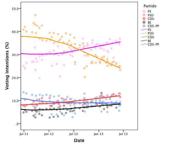 PSD’s decline is steeper than PS’s rise, since smaller parties – not the government partner CDS-PP, but rather BE and, especially, CDU – seem to be on the rise too. Not quite like Spain, where IU and UPyD are now worth something like 30% of vote intentions. However, these two Portuguese parties, both to the left of the Socialists, are clearly worth a combined 20% of vote intentions. BE’s potential in an actual election is always a bit questionable, as it has a more fickle and volatile electorate. But CDU’s performance deserves greater atention. Although the Communists typically have good polls in the middle of electoral cycles and always tend to decline as the election approaches and campaigns start mobilizing other sorts of voters, CDU hasn’t had such a consistent string of good results in polls since at least 2005. And let’s say they get 10% in the next election. This would be their best score since…1987.