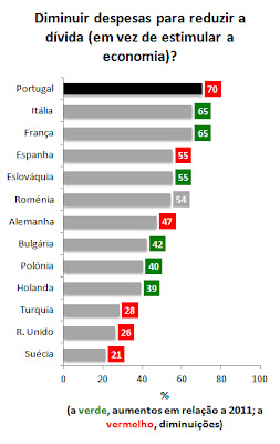 Apesar da diminuição em relação a 2011, Portugal continuava em Junho o campeão da defesa do corte das despesas do Estado. Claro, a pergunta é colocada em abstracto, sem especificar onde se corta, o que facilita o apoio. Para além disso, cortar despesas é bastante diferente de aumentar impostos ou contribuições para a segurança social, o que nos deve tornar ainda mais cuidadosos sobre interpretações destes resultados como sendo de “apoio” às medidas de quaisquer governos. Mas dito isto, há (ou talvez mais exactamente, havia em Junho) um capital político não irrelevante de apoio a uma redução das despesas do estado nalguns países, especialmente em Portugal. Já o que se fez com esse capital é outro assunto.