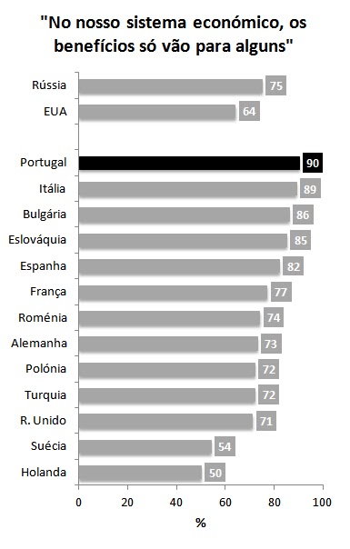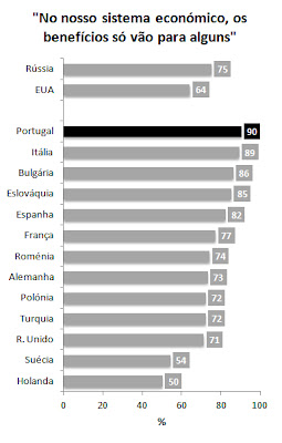 Tal como sucede em todos os estudos que alguma vez me lembro de ter visto sobre este tema, Portugal destaca-se por uma sensibilidade particularmente elevada às questões da justiça distributiva do sistema económico. Num país tão desigual como o nosso e, porventura, com uma cultura política marcada ainda pelo 25 de Abril, não creio que isto seja particularmente surpreeendente. O que surpreende é que seja tão frequentemente esquecido.